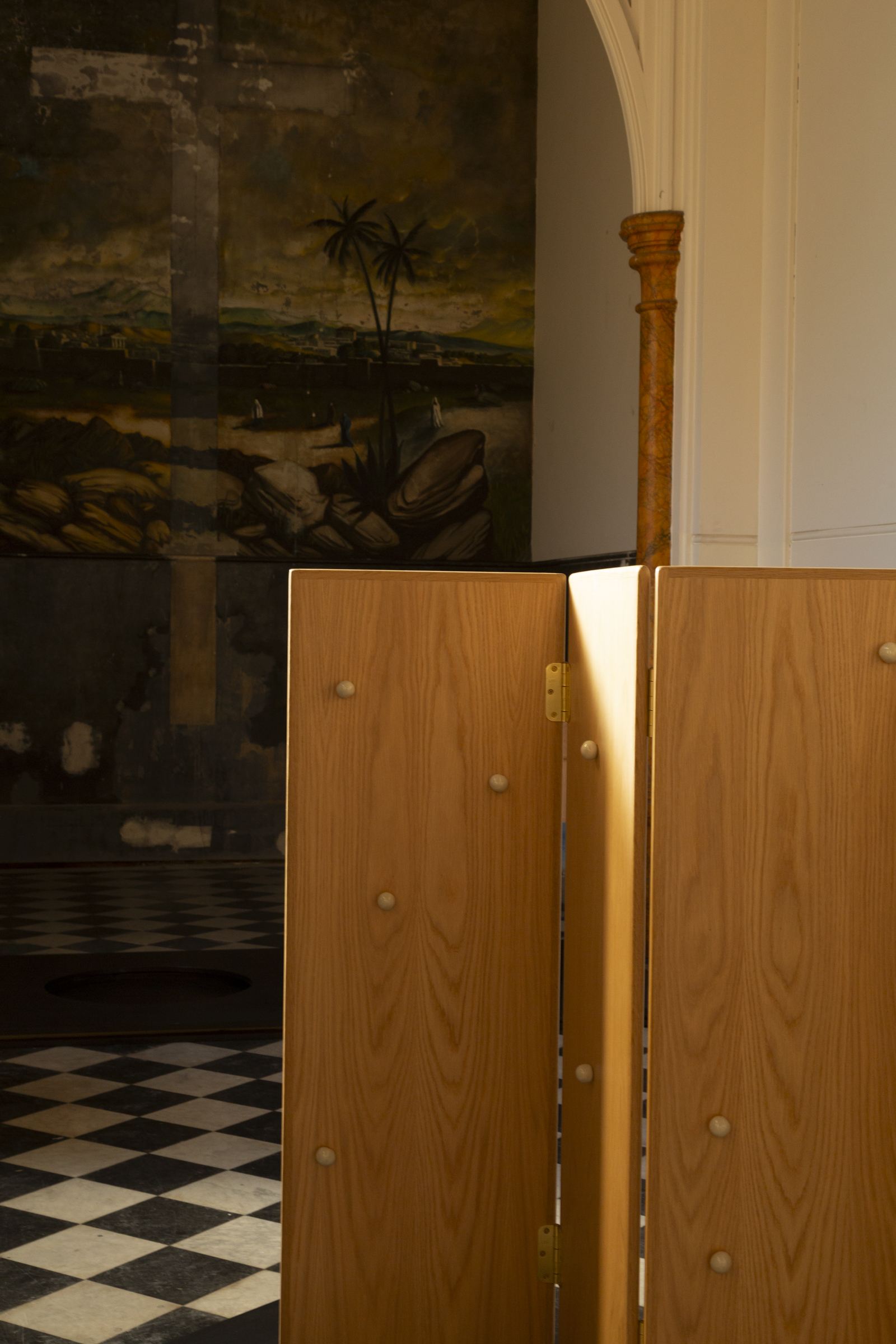 The room divider unfolds rhythmically with ceramic dots and oversized brass hinges.